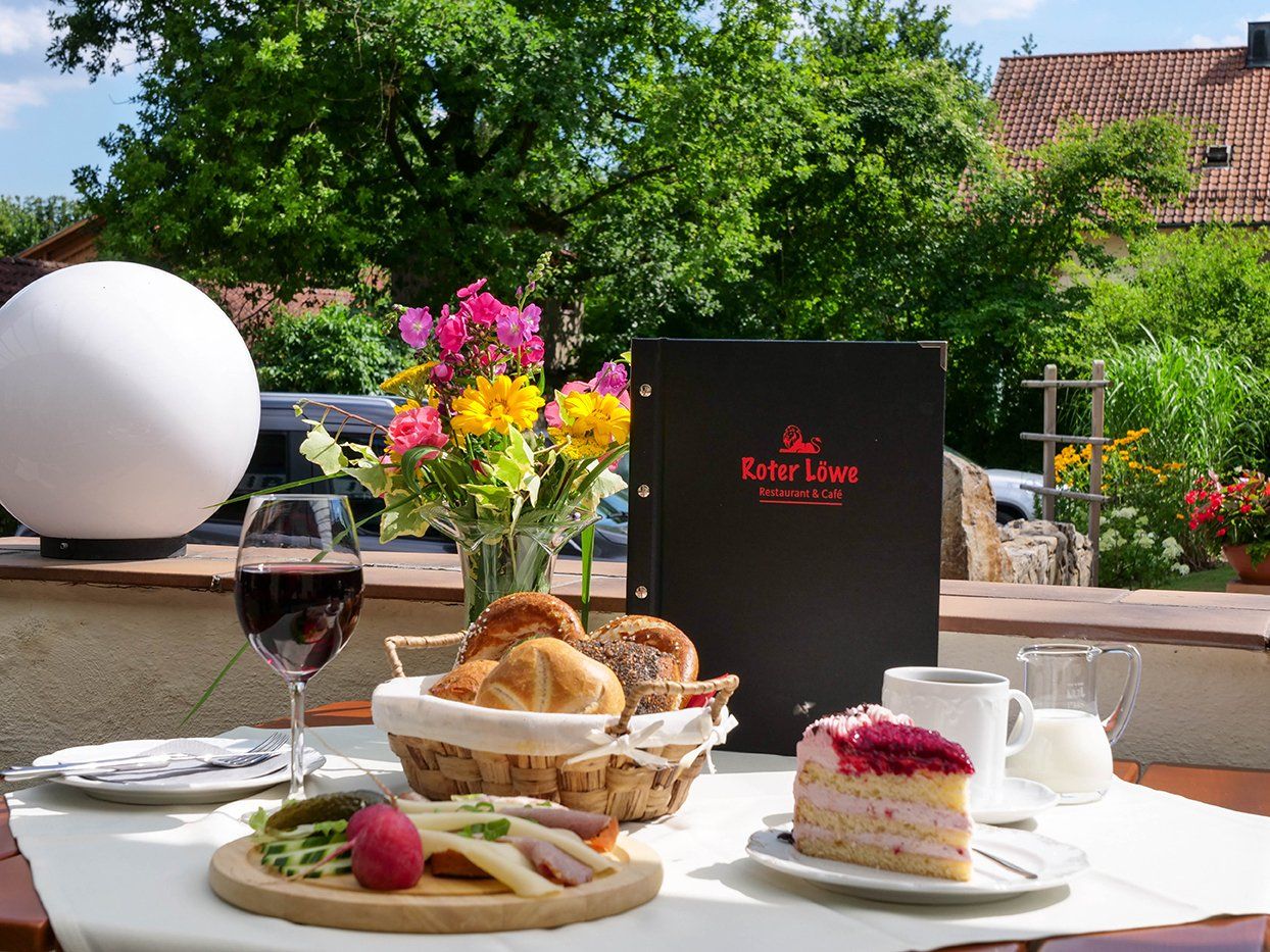 Im Wochenend-Café gibts selbstgemachte Kuchen. Dazu verschiedene Kaffee- und Tee-Spezialitäten. Darfs ein Gläschen Wein zur Brotzeit sein? Bayerische Gemütlichkeit im ›Roten Löwen‹.